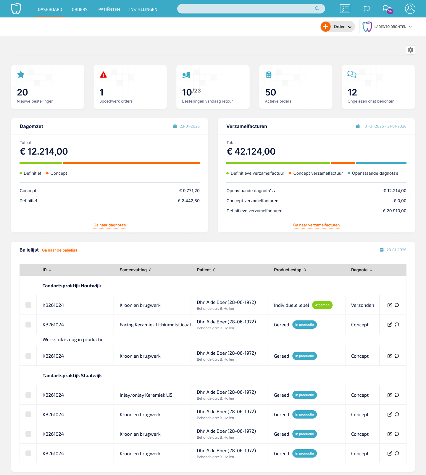 Geen gedoe meer met papier en verstevig de grip op uw administratieve processen. Richt uw laboratorium in. Daarna kunnen de tandartsen direct online bij uw laboratorium bestellen. Lekker snel en makkelijk!