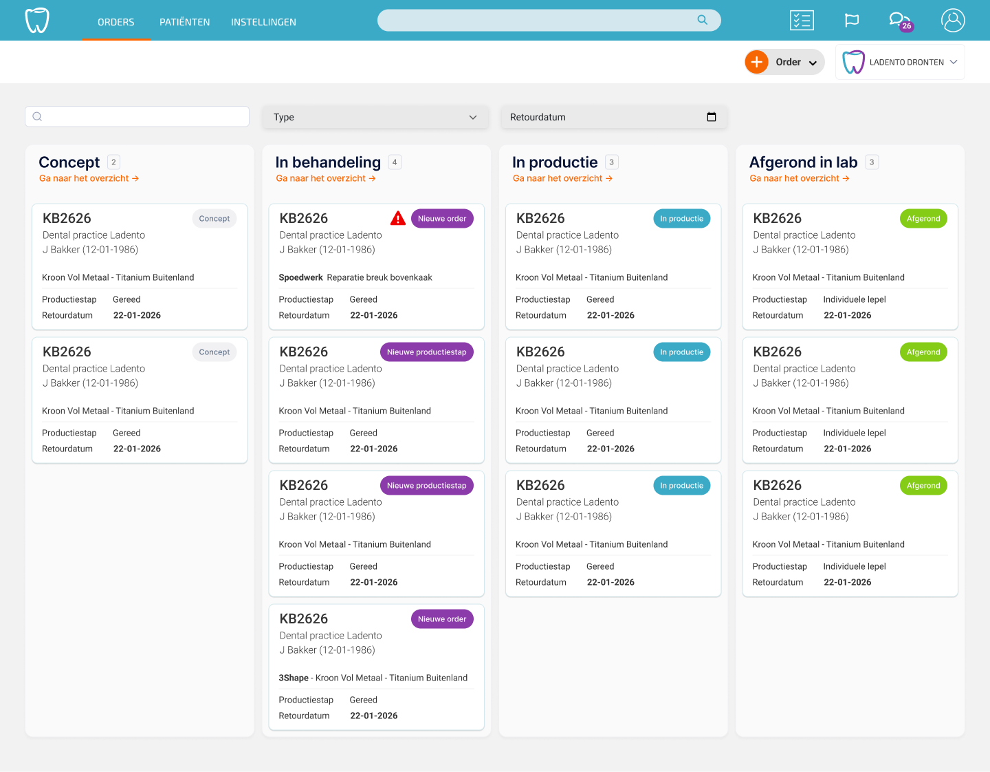 Met Ladento weet je altijd precies waar je bestelling staat. Zodra je een order indient bij het laboratorium, wordt deze automatisch zichtbaar in je overzicht. Van ontvangst tot productie en oplevering: elke stap in het proces is eenvoudig te volgen. Zo hoef je nooit meer te bellen om te vragen naar de status van een opdracht.
