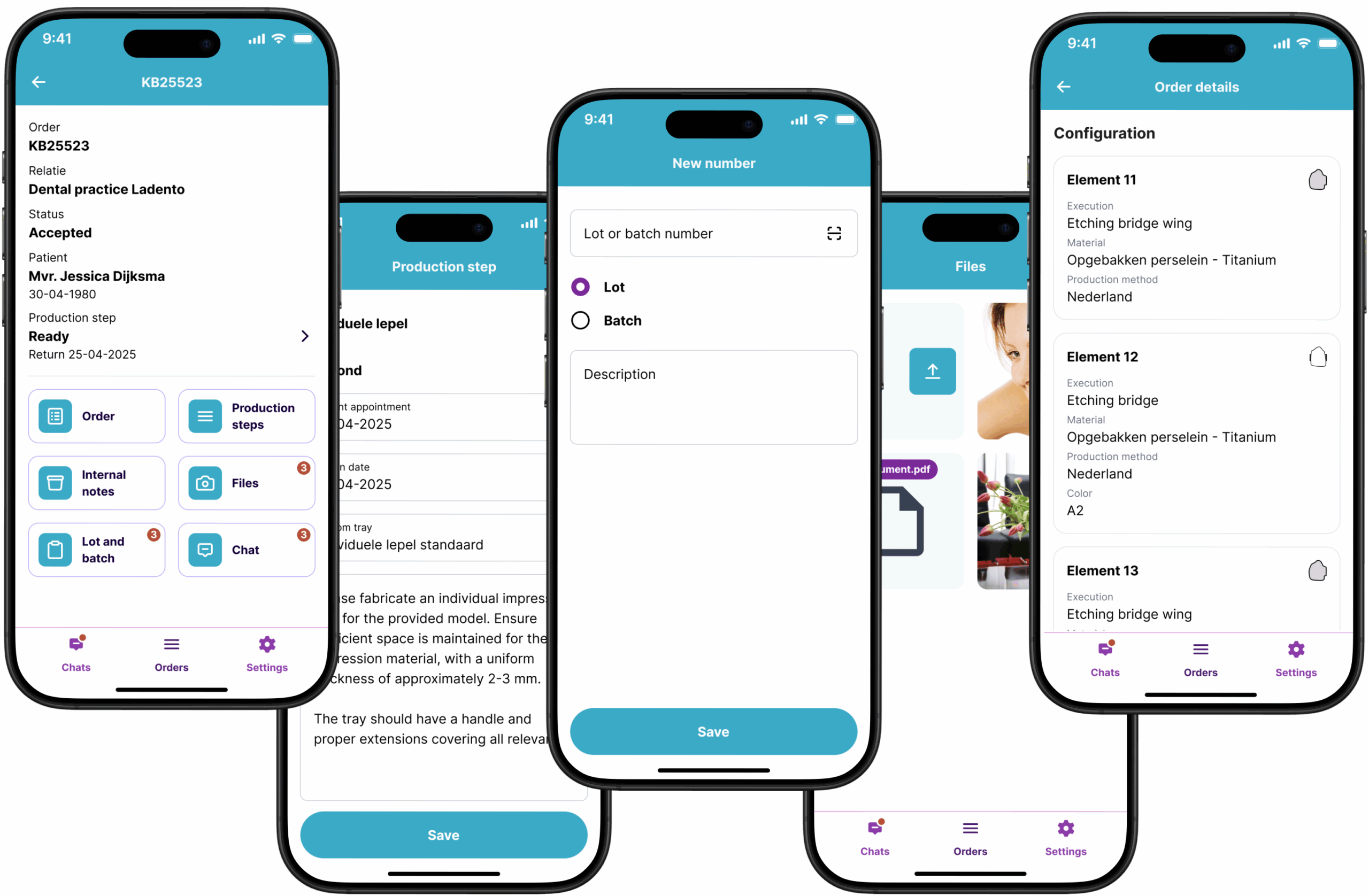 Met de app heb je altijd inzicht in de actuele status van je orders. Je kunt orders inzien en bewerken, zodat je details direct kunt aanpassen of aanvullen. Het aanmaken van nieuwe bestellingen verloopt nog altijd via de webapplicatie, maar de app maakt je dagelijkse workflow onderweg of in het lab veel flexibeler.