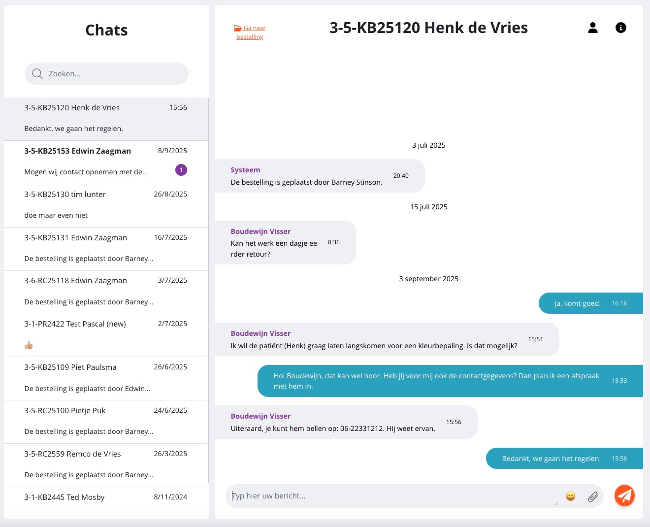 De chatfunctie stond aan de basis van de Ladento App. Behandelaren en tandtechnisch kunnen direct berichten sturen en ontvangen, zonder dat er gebeld hoef te worden. Alle communicatie blijft gekoppeld aan de juiste order en is altijd terug te vinden – ook mobiel.