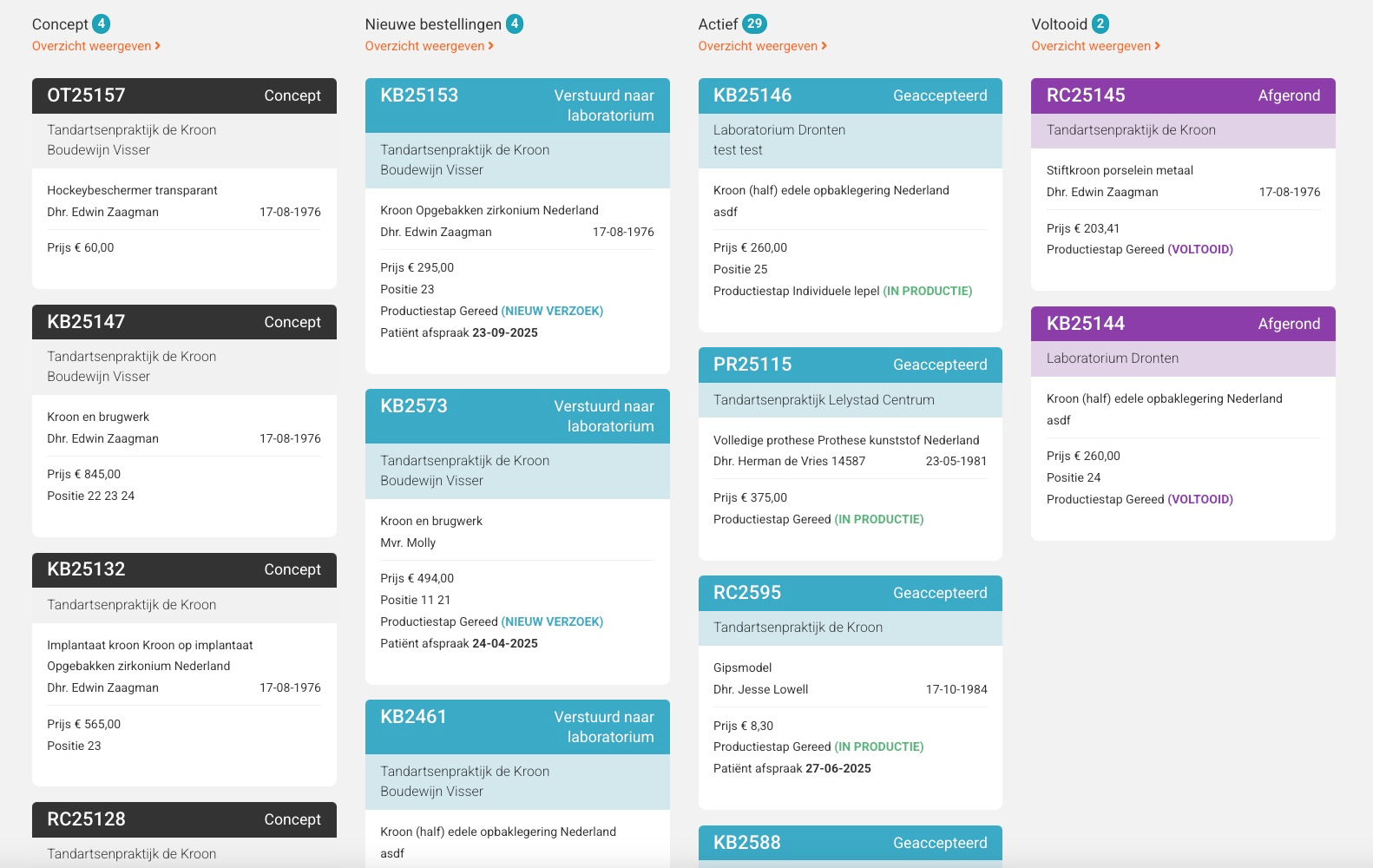 Met het Ladento heb je altijd grip op je bestellingen. Alle orders komen digitaal binnen, worden overzichtelijk weergegeven en zijn eenvoudig te filteren. Zo houd je als laboratorium volledige controle over je workflow en omzet.